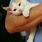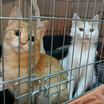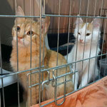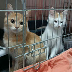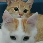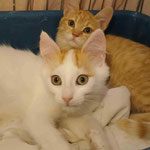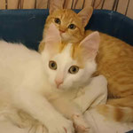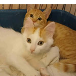 Cinnamon (red girl, semi-longhair, castrated) and Diamond (white-red boy, semi long-hair, not castrated), a brother and sister of around 6 months old. Extremely sweet and cuddly, very