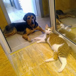 Ich bin verträglich mit Hunden und Katzen, aber manchmal kann ich etwas grob zu Katzen sein, besonders beim Spielen. Neue Hunde machen mich anfangs vorsichtig, aber ich schließe schnell