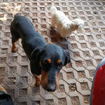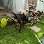 Mein Pflegefrauchen sagt, ich sei unglaublich gelehrig: Ich mache schon brav „Sitz“, höre auf „Nein“ und „Aus“ und laufe sowohl an der langen als auch an der kurzen Leine schon richtig