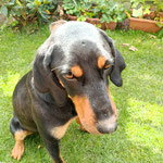 Hallo, ich bin Meghan – eine wunderschöne Hündin mit glänzend schwarzem Fell und braunen Abzeichen, die meinem Gesicht einen ganz besonderen Ausdruck verleihen. Ich bin vermutlich eine Bracke-Mix
