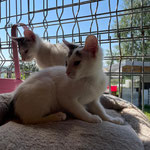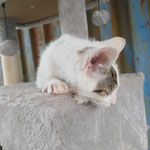 Ich bin eine kleine Katzenlady mit einer charmanten Persönlichkeit. Mein weißes Fell mit den zarten Flecken macht mich zu einer richtigen Schönheit, und meine großen, leuchtenden Augen blicken