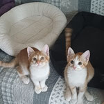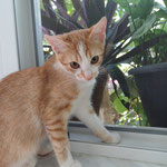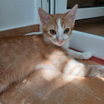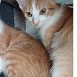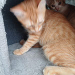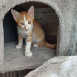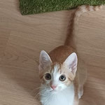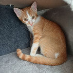 Hallo, ich bin Peach – ein kleiner, orangefarbener Charmeur mit einem hübschen weißen Streifen im Gesicht und zarten weißen Abzeichen an Brust und Pfötchen. Meine neugierigen Augen, die keine