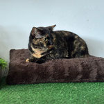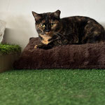 Hallo, ich bin Tina – eine junge Katzendame mit einem ganz besonderen Look! Mein wunderschönes Schildpatt-Fell vereint Schwarz, Braun und Orange in einem einmaligen Muster, das mich