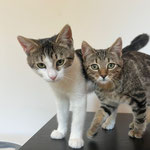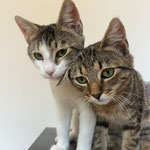 Ich, Timmy, bin ein hübscher, weiß-grauer Kater mit neugierigem Blick, während mein Bruder Tommy mit seinem tabby-gestreiften Fell aussieht wie ein kleiner Wildkater – dabei sind wir beide